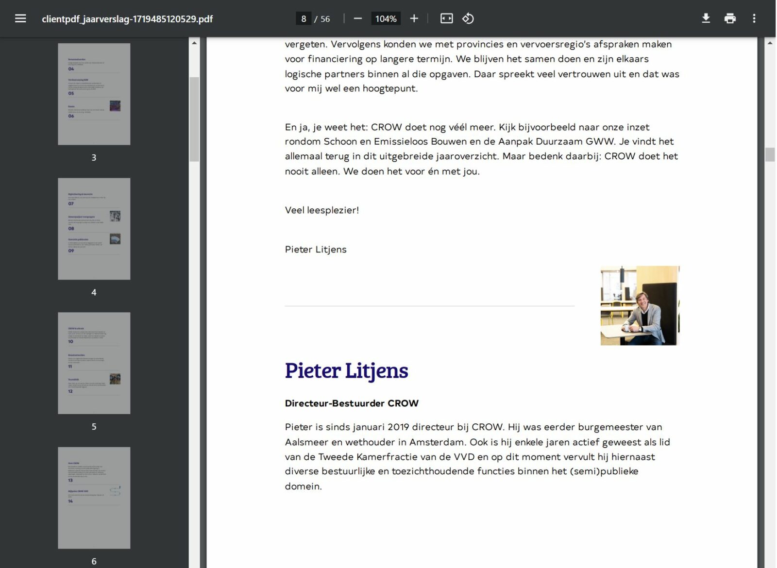 Even tot slot: ik hoop dat dit jaarverslag voor herkenning heeft gezorgd. En inspiratie natuurlijk. Want het gaat over jullie en over ons. Vanuit CROW proberen we sinds jaar en dag de partijen te verbinden. Daar zit onze grote kracht en dat zullen we ook in 2024, 2025 en de jaren daarna met veel plezier blijven doen. Daarom zeg ik: pluk de vruchten van elkaars werk, zoek die samenwerking en blijf optimistisch over de stappen die we als collectief kunnen zetten.